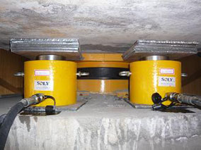 由于交通日益繁忙,公路橋梁與立交橋的加固工作被提上了議事日程。通過增加附加的橋墩并把橋粱的載荷平均分配到老橋墩上.可以提高車流量。采用超薄型液壓千斤頂或自鎖式液壓千斤頂頂升橋梁,更換墊層,最后放回新的橋墩位置。看起來液壓似乎能做任何事情,當面對這一類工程問題時,系統設計就成為了關鍵的問題.通過我們與客戶之間的密切合作以及我們在該領域豐富的知識經驗的積累.可以使這類工程取得圓滿成功。